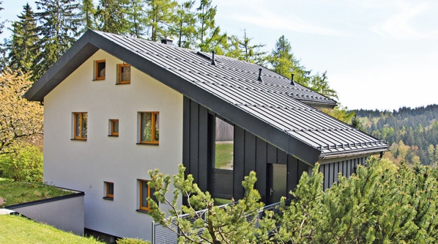 Rodinný dům v Beskydech, který má střechu i fasádu zhotovenou z černého hliníkového plechu Prefalz s povrchovou úpravou Stucco je dílem..