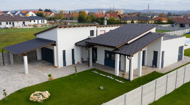 Nevšední šikmá střecha z hliníkových šindelů Prefa dominuje krásnému domu u Dvora Králové