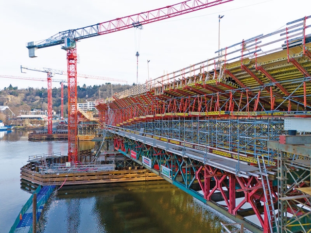 - Stavebnice VARIOKIT pro inženýrské stavby přinesla ideální kombinaci robustnosti, rychlé montáže a maximální přizpůsobivosti specifickým požadavkům stavby.Kromě standardních systémů sehrála klíčovou roli také zakázková výroba z tesárny PERI. Šlo o unikátní prvky vyráběné přesně podle 3D modelů, které by na stavbě nebylo možné připravit s dostatečnou přesností. V rámci spodní stavby zhotovitel využíval také předmontáž jednotlivých částí bednění, což významně urychlilo celý proces výstavby. Bylo přitom kritické naladit prefabrikaci tak, aby jednotlivé díly na sebe bezchybně navazovaly.