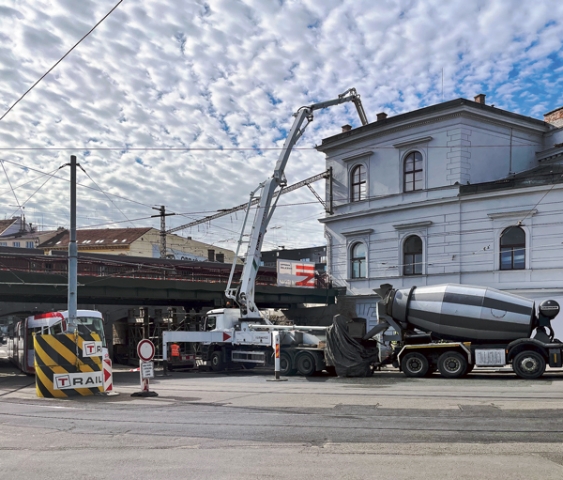 Jedním z klíčových opatření při realizaci bylo zajištění prostoru pro stavební mechanizaci v podjezdu. Pro tento účel bylo nutné převěsit trakční vedení městské hromadné dopravy. Vodiče tramvají a trolejbusů byly dočasně zavěšeny na nově vytvořenou ocelovou „hrazdu“, upevněnou přímo ke klenbovému mostu. Toto provizorní řešení umožnilo vytvořit dostatečný manipulační prostor pro jeřáby, betonové pumpy a další zařízení, aniž by byla ohrožena plynulost provozu MHD mimo vymezené výluky.