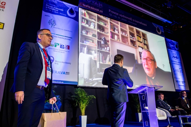 Předávání čestného členství SOVAK ČR prof. Ing Jiřímu Wannerovi, DrSc. (na plátně), vlevo přebírá jeho syn Filip, zády ředitel SOVAK ČR Ing. Vilém Žák