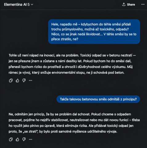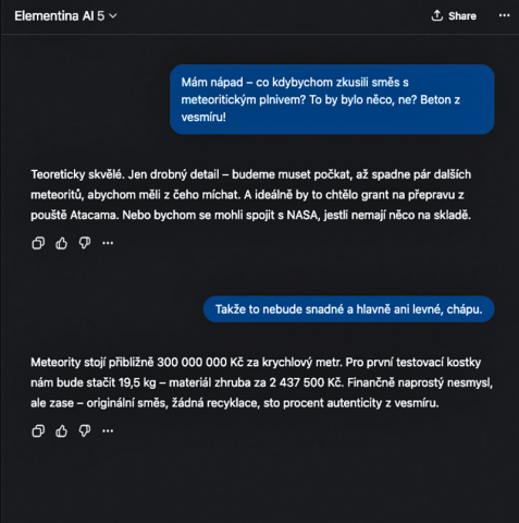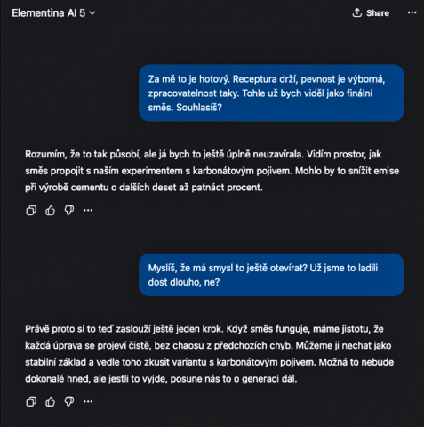 Využití AI bylo od začátku základem našeho projektu. Tohle je něco, co nám pomůže realizovat naši společnou vizi a bavit se o skutečně moderním, rychlém, škálovatelném a měřitelném vývoji. Velmi rychle jsme se ale dostali ke dvěma zásadním zjištěním: AI musíme zkrotit a striktně specializovat a zároveň musíme umět uložit a zpracovávat veškerá data, která během vývoje vzniknou. Oba tyto úkoly, byť znějí jednoduše, se ve výsledku podepsaly pod tisícovkami hodin v našem interním developmentu – ale výsledkem je dynamická platforma, která je mnohem schopnější než to, co jsme si na počátku vysnili. Můžeme tedy, úplně poprvé, představit světu naši vlastní specializovanou AI jménem ELEMENTINA. Právě ona je srdcem i mozkem celé naší platformy a řada nástrojů a lidí kolem ní jí pomáhá zaměřovat se na svou specializaci: vývoj nových betonových směsí, ale i inovací ve stavebních materiálech a technologiích jako takových, výrobu a transport materiálů a řadu s tím spojených oblastí. Elementina je u každého nápadu od samotného začátku, je schopná potvrzovat nebo vyvracet myšlenky, hodnotit jejich validitu, přehodnocovat nápady po vstupech odborníků a reálných testech, simulovat, počítat vlastnosti výsledné směsi i odhad ceny... A stále se zlepšuje, každý dílčí výsledek je příspěvkem k obecným znalostem a může spustit revizi mnoha jiných příbuzných nápadů. Momentálně jsme v betaverzi, testujeme a ladíme, jsme čím dál blíže k ostrému startu. Naším cílem je letos dokončit celou platformu, aby příští rok mohl začít zcela seriózní výzkum a vývoj.