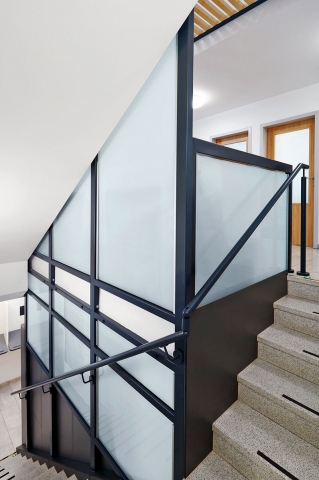 - Instalaci ocelové konstrukce se mléčným sklem u schodiště zajišťující přirozené osvětlení při zachování soukromí